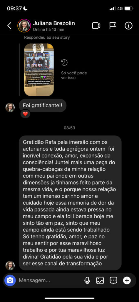 Já ajudei mais de 1000 irmãos a despertarem em sua consciência espiritual. Já realizei mais de 3 mil atendimentos só com o Thetahealing, e hoje me coloco exclusivamente a ajudar irmãos e irmãs de jornada a acolherem sua conexão pessoal.